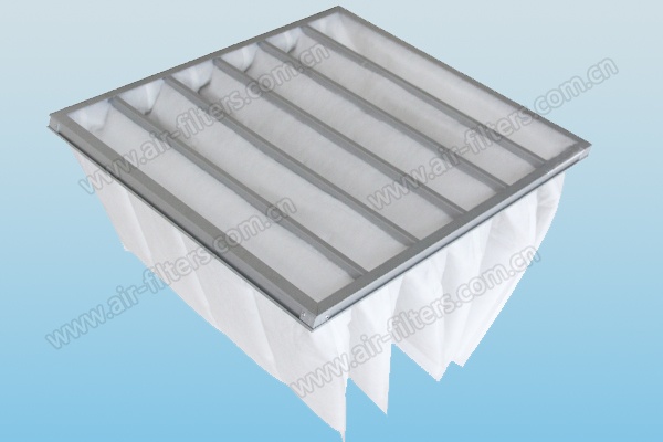 袋式初效过滤器由合成纤维作为滤料和金属框作为框架制作而成。主要过滤5~10um以上的灰尘。好的新型复合无纺布过滤棉,经特殊工艺处理,形成加密的结构,从而使过滤器能达到低阻力高容尘量。